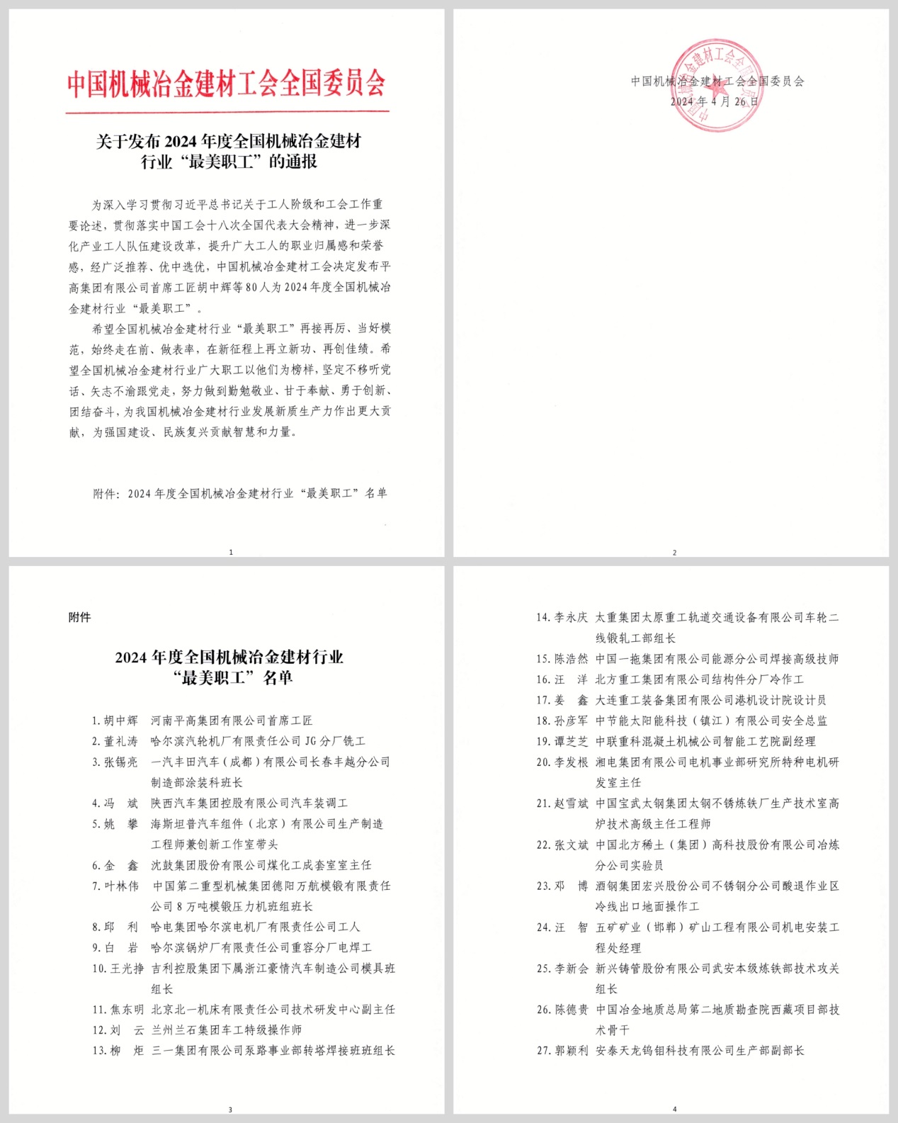 为深入学习贯彻习近平总书记关于工人阶级和工会工作重要论述精神,贯彻落实中国工会第十八次全国代表大会精神,进一步深化产业工人队伍建设改革,中国机械冶金建材工会评选出80名2024年度行业 “最美职工”。 由中国钢研集团工会推荐的安泰天龙钨钼科技有限公司郭颖利同志荣获该项殊荣。
