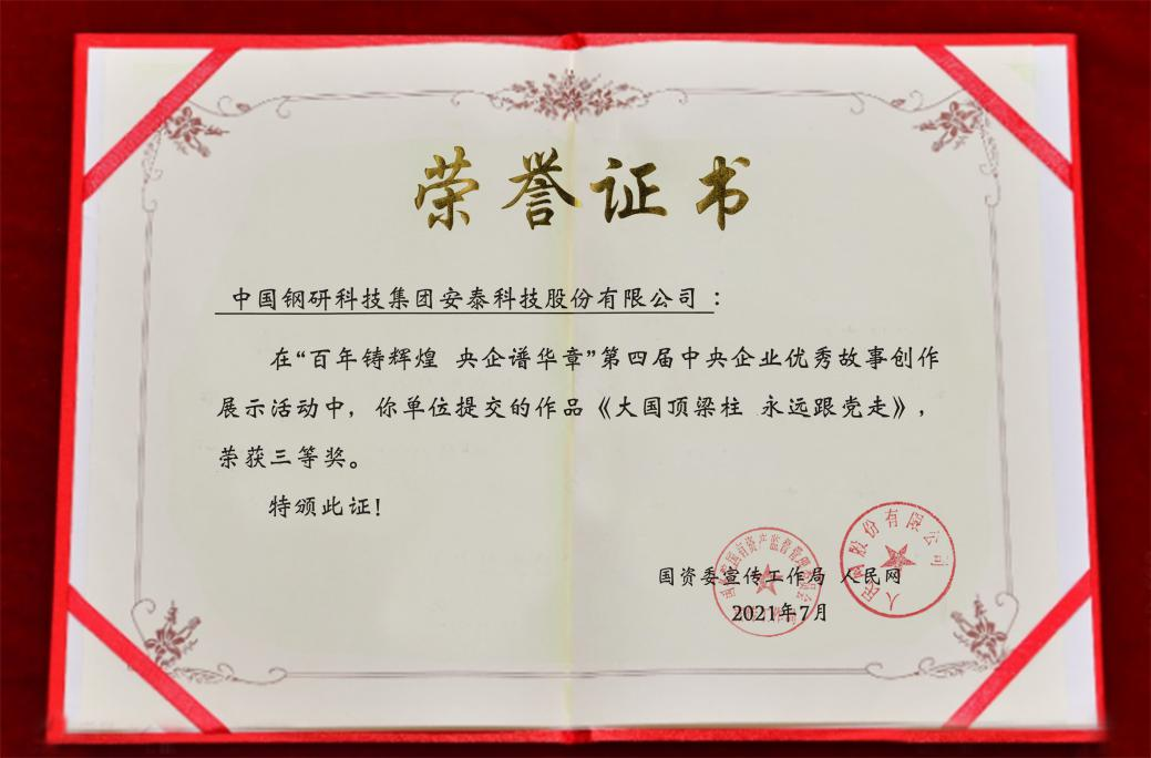 7月30日,由国资委宣传局、人民网联合主办,中国共产党新闻网承办的“百年铸辉煌 央企谱华章”庆祝建党百年暨第四届中央企业优秀故事发布活动在北京举办。国资委党委委员、副主任谭作钧出席活动并为获奖代表颁奖。安泰环境《大国顶梁柱 永远跟党走》视频类作品荣获此次活动三等奖。